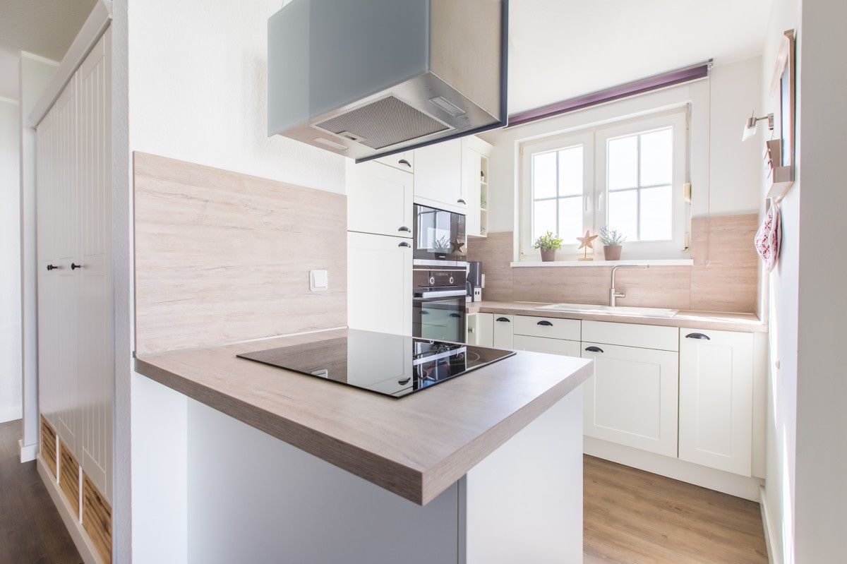 Die Fewo verfügt über zwei Schlafzimmer (1x Doppelbett 1,80 x 2,00m; 1x kl. Doppelbett 1,40 x 2,00m), ein Bad mit Dusche und ein Gäste-WC. Der Wohnbereich ist mit einer gemütlichen Couchecke und einem Essbereich in hellen Farben ausgestattet. Die Küche findet sich etwas abgetrennt, angrenzend an den Wohnbereich.