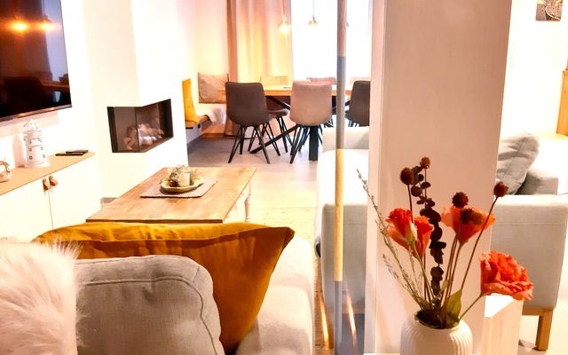 Der offene, lichtdurchflutete Wohnbereich mit integrierter, optimal ausgestatteter Küche lädt zum gemeinsamen Kochen oder Relaxen auf den Sofas oder vor dem Gaskamin ein. Am großen Esstisch, von dem man durch die bodentiefen Fenster in den Garten blickt, finden 8 Personen bequem Platz.