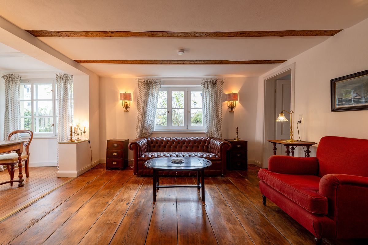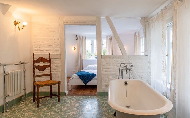 Unsere mit vielen Schätzen eingerichtete Ferienwohnung "Auguste" in der Villa Gustavia in der Altstadt von Sassnitz verfügt über ein Schlafzimmer mit angeschlossenem offenen Bad mit freistehender Badewanne, einer Küche mit Zugang zum Balkon und einem gemütlichen Wohnraum. Ein Parkplatz vor dem Haus steht zur kostenfreien Nutzung bereit.