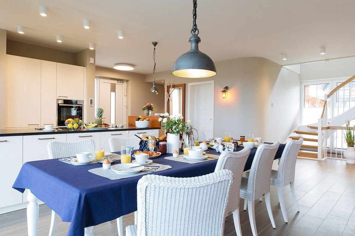 Ein Tischtennisraum im Untergeschoss lädt zu sportlichen Aktivitäten ein.Die großzügige, voll ausgestattete offene Küche wird zum zentralen Treffpunkt. Drei moderne Bäder mit Dusche sowie insgesamt vier WCs bieten hohen Komfort. Das Haus verfügt zudem über vier Flat Screen TVs und eine stabile High Speed WLAN-Verbindung. Waschmaschine und Trockner stehen ebenso zur Verfügung. Im abschließbaren Carport können Fahrräder sicher abgestellt werden.