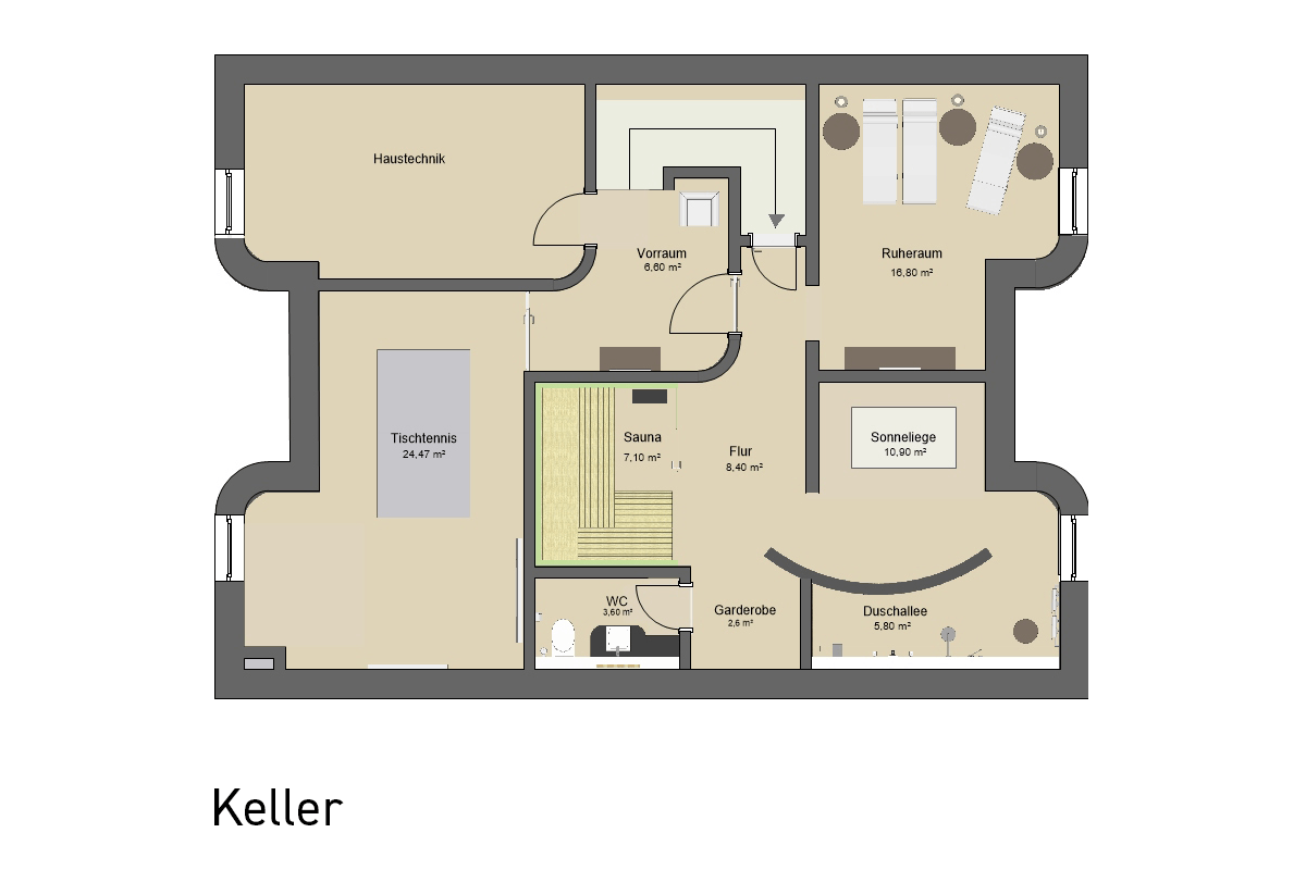- Wellnessbereich im UG (Sauna/Sanarium, Sonnenwiese, Duschallee, Ruheraum, Tischtennisplatte, WC)