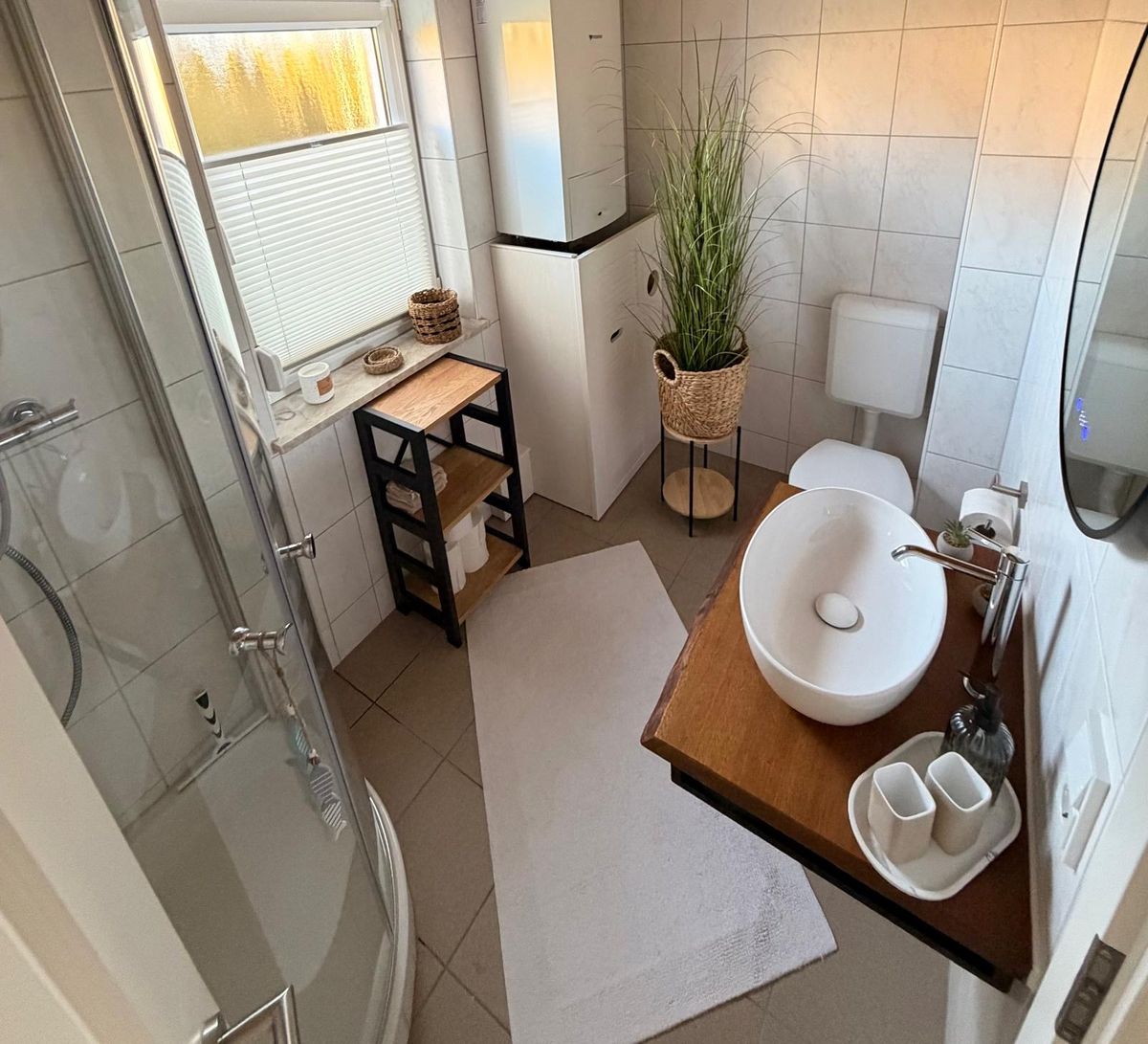 Das moderne Badezimmer verfügt über eine großzügige Dusche sowie einen praktischen Waschtrockner und bietet damit zusätzlichen Komfort, insbesondere bei längeren Aufenthalten oder Reisen mit der Familie.