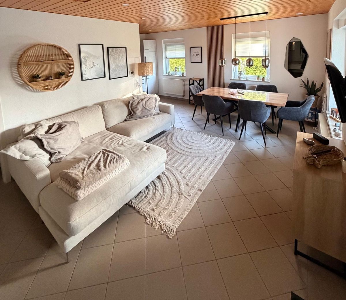 Der offen gestaltete Wohn- und Essbereich ist lichtdurchflutet und bildet den zentralen Treffpunkt des Bungalows. Hier lädt eine angenehme Wohnatmosphäre zum gemeinsamen Entspannen, Essen und Verweilen ein. Die neuwertige, moderne Küche ist vollständig ausgestattet und bietet alle Extras, die unsere Gäste für einen komfortablen Aufenthalt benötigen, ideal sowohl für das schnelle Frühstück als auch für gemütliche Kochabende.