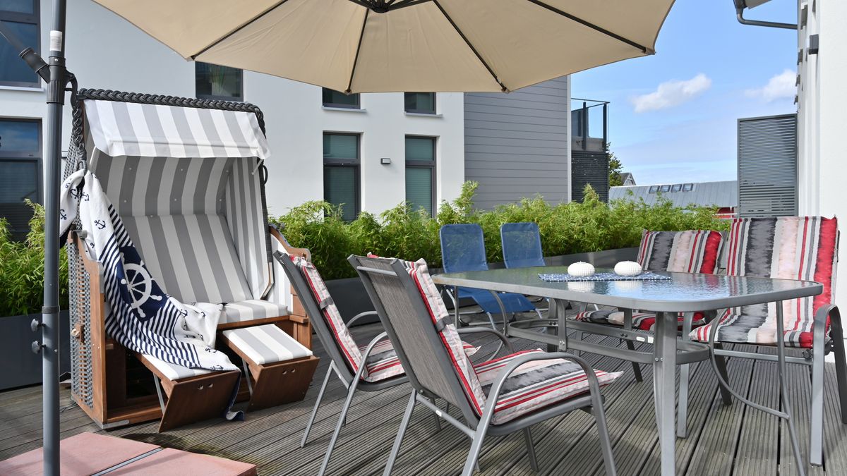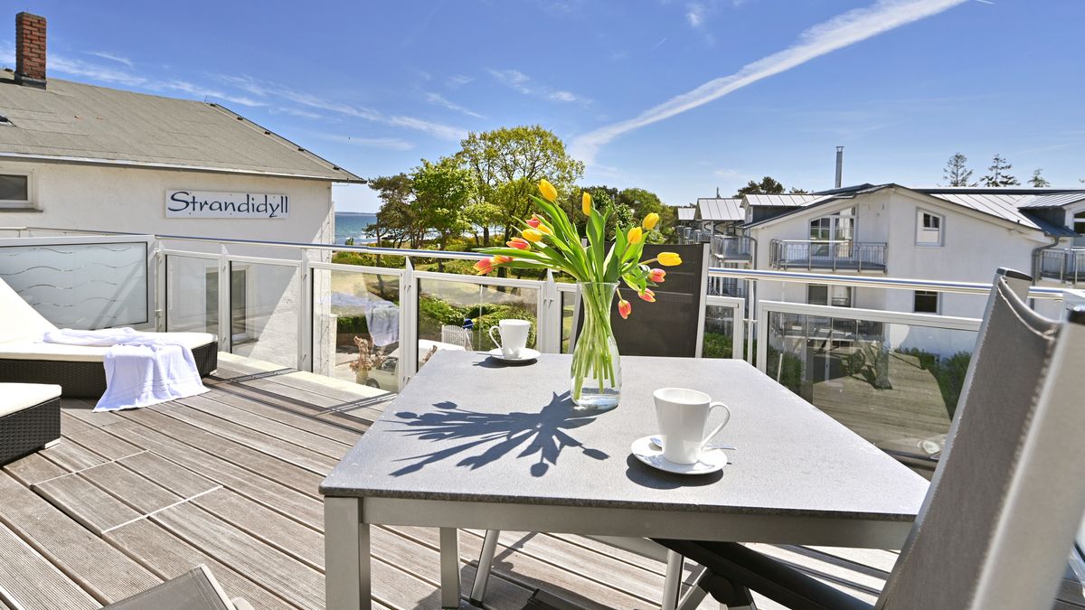 Auch aus der Unterkunft genießen Sie die Nähe zum Strand und den weiten Blick über das Meer. "KALA" verfügt über einen Nord-Balkon und eine Süd-Dachterrasse, ein Schlafzimmer mit Doppelbett und einen großzügigen Wohnbereich mit Ethanol-Kamin und integrierter Küche und Essbereich.